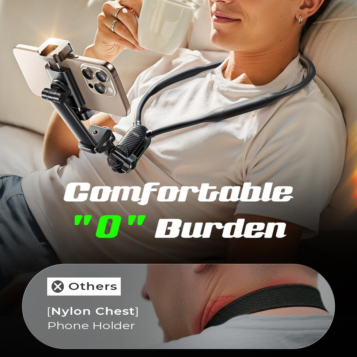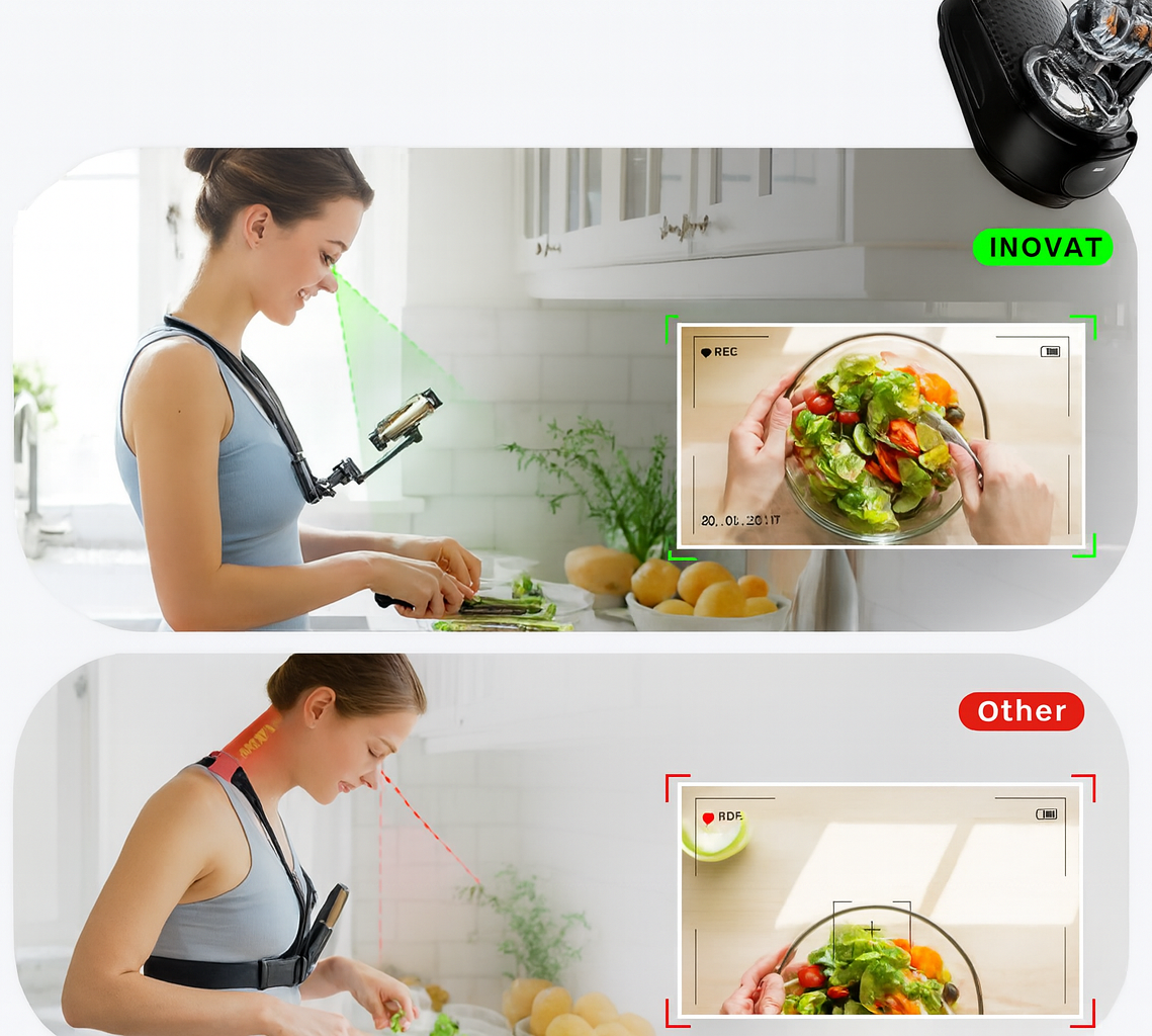 A diferencia de los soportes rígidos o de nylon que rozan la piel, se marcan en el cuello y generan molestia con el movimiento, VisionTrack™ incorpora un sistema de soporte de goma suave, flexible y ergonómico que se adapta al cuerpo sin causar irritación. Puedes usarlo por horas durante grabaciones, caminatas, pesca, viajes o streamings sin sentir presión ni incomodidad.